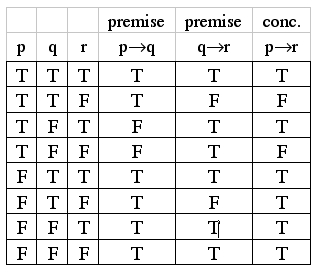 Notice that in this truth table there is NO ROW in which both premises are true while the conclusion is false.
