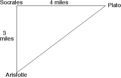 The distance (D) between Plato and Aristotle is the hypotenuse of a right triangle whose legs measure 3 miles and 4 miles, respectively. According to the Pythagorean Theorem,