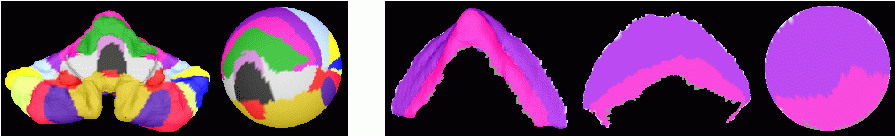 Figure 1. Conformal flat maps of the human cerebellar cortex. Left panel : Parcellated surface of the cerebellum and its flat map on S; Right panel : Patch from cerebellar Lobes IV and V and its flat maps in a predefined planar region and on D.