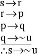 In order to form a valid conclusion, we may need to change the order in which the premises are listed. Remember: we want the first premise to be a statement whose antecedent is a variable that appears only one time in the entire scheme. The variables that appear only once are s and u. That means that we could use either